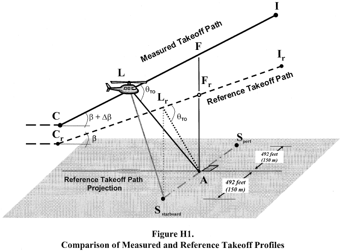 (2) The reference flight path is defined as a straight line segment inclined from the starting point (1,640 feet (500 meters) from the center microphone location and 65 feet (20 meters) above ground level) at a constant climb angle β defined by the certificated best rate of climb and Vy for minimum engine performance. The constant climb angle β is derived from the manufacturer's data (approved by the FAA) to define the flight profile for the reference conditions. The constant climb angle β is drawn through Cr and continues, crossing over station A, to the position corresponding to the end of the type certification takeoff path represented by position Ir.