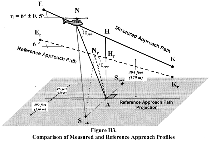(3) Figure H3 illustrates portions of the measured and reference approach flight paths including the significant geometrical relationships influencing sound propagation. The measured approach path is represented by segment EK with an approach allowable angle θ. Reference positions, Er and Kr, define an idealized reference approach angle of 6°. Position N represents the helicopter location on the measured approach flight path for which PNLTM is observed at measuring station A, and Nr is the corresponding position on the reference approach flight path. The measured and reference noise propagation paths are AN and ANr, respectively, both of which form the same angle, θAPP, corresponding to PNLTM relative to their approach flight paths.