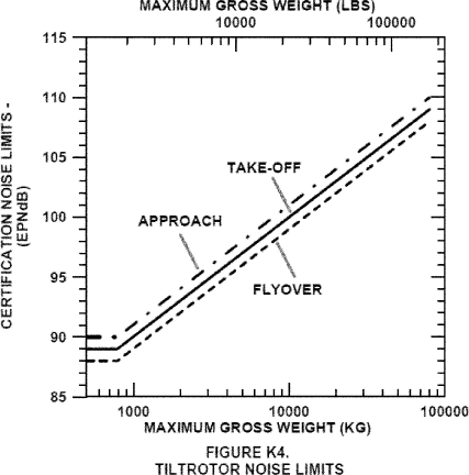 (c) At the approach flight path reference point: For a tiltrotor having a maximum certificated takeoff weight (mass) of 176,370 pounds (80,000 kg) or more, in VTOL/Conversion mode, 110 EPNdB, decreasing linearly with the logarithm of the tiltrotors weight (mass) at a rate of 3.0 EPNdB per halving of weight (mass) down to 90 EPNdB, after which the limit is constant. Figure K4 illustrates the approach noise limit as a dash-dot line.