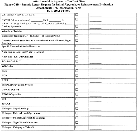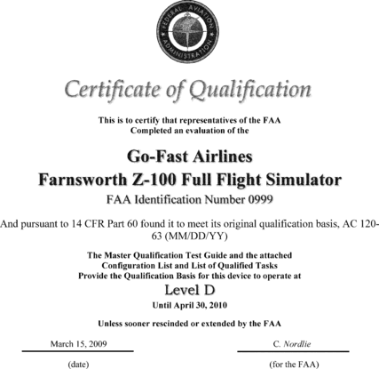 Summary: Notwithstanding the authorization listed in paragraph 13b in Appendices A and C of this part, this FSTD Directive requires each certificate holder to ensure that by May 30, 2009, except for the airport model(s) used to qualify the simulator at the designated level, each airport model used by the certificate holder's instructors or evaluators for training, checking, or testing under this chapter in an FFS, meets the definition of a Class II or Class III airport model as defined in 14CFR part 60. The completion of this requirement will not require a report, and the method used for keeping instructors and evaluators apprised of the airport models that meet Class II or Class III requirements on any given simulator is at the option of the certificate holder whose employees are using the FFS, but the method used must be available for review by the TPAA for that certificate holder.