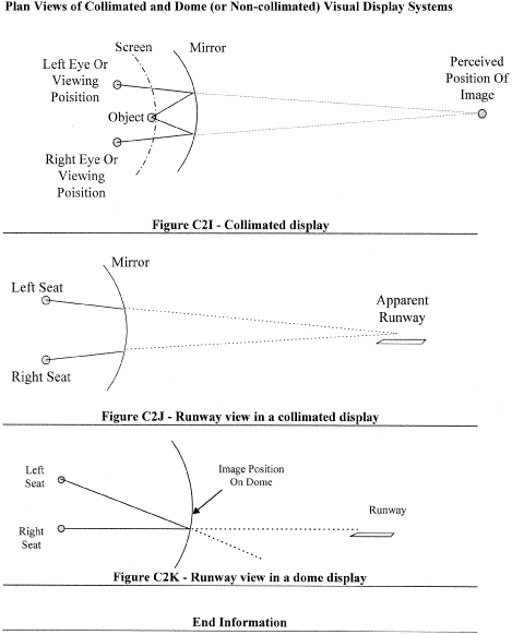(3) Collimated displays are well suited to many simulation applications as the area of interest is relatively distant from the observer so the angles to objects should remain independent of viewing position. Consider the view of the runway seen by the flight crew lined up on an approach. In the real world, the runway is distant and the light rays from the runway to the eyes are parallel. The runway appears to be straight ahead to both crew members. This situation is well simulated by a collimated display and is presented in Figure C2B. Note that the distance to the runway has been shortened for clarity. If drawn to scale, the runway would be farther away and the rays from the two seats would be closer to being parallel.