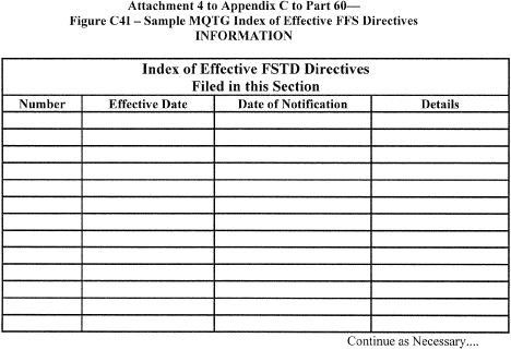 7. A copy of this Directive must be filed in the MQTG in the designated FSTD Directive Section, and its inclusion must be annotated on the Index of Effective FSTD Directives chart. See Attachment 4, Appendices A through D of this part for a sample MQTG Index of Effective FSTD Directives chart.